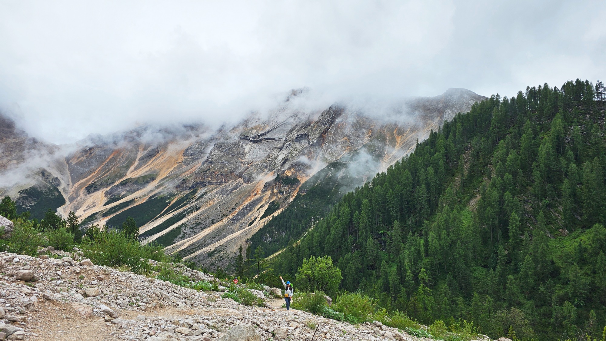 낮은 구름과 암벽을 배경으로 오르막 트레일을 걸어오는 트레커의 모습이