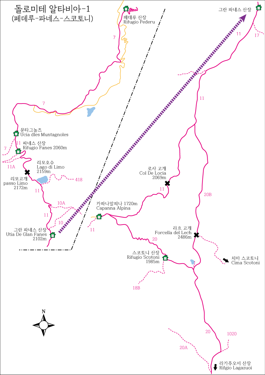 ☞ 페데루산장(1,548m) - 파네스산장(2,060m) - 그란파네스(2,102m) - 로사고개(2,069m) - 카파나 알피나(1,720m)